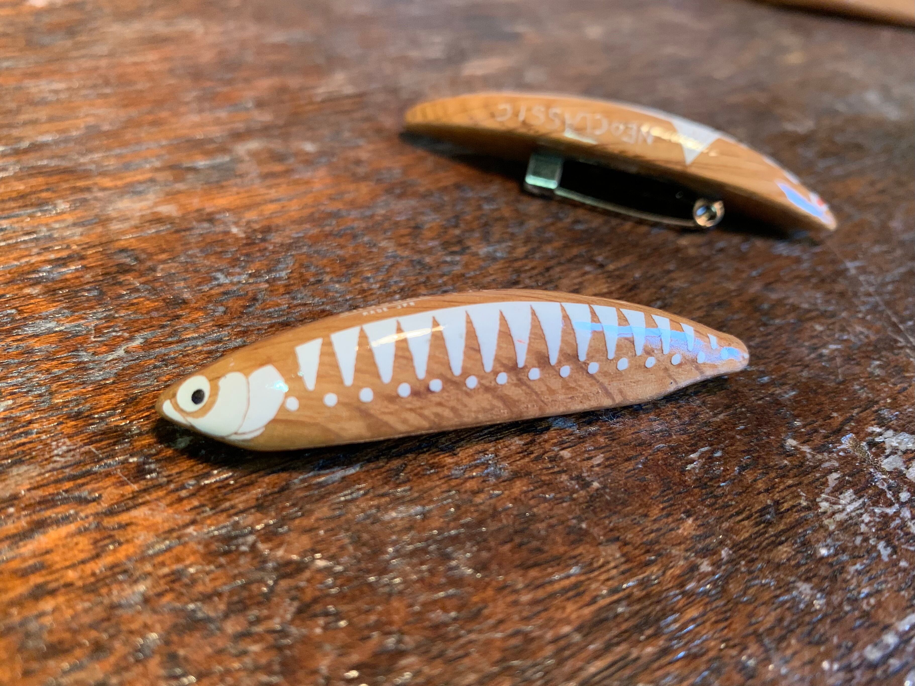 リアルな魚のブローチとは違ったポップでクラッシックな雰囲気のミノーブローチになります。