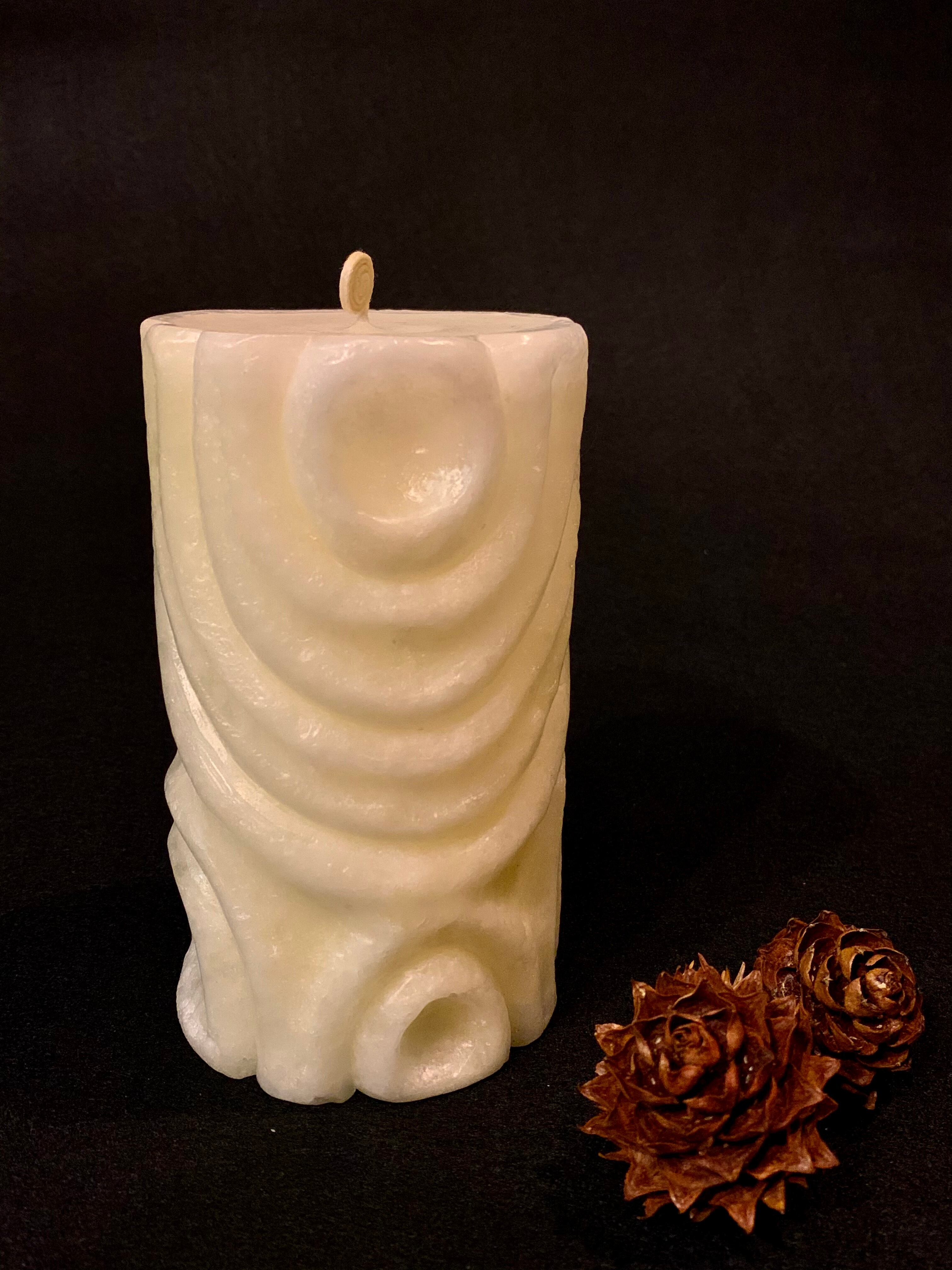 円柱状のキャンドルにノミと彫刻刀をつかってフリーハンドで彫刻を施したキャンドルになります。火を灯した時に灯りが内側にこもるように側面には少し不透明で融点の高いミツロウをブレンドしたワックスを使用しています。